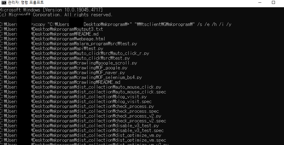 "C:\Users\****\Desktop\mkprogram\*": 복사할 원본 파일이 있는 경로입니다. 별표(*)는 모든 파일을 의미합니다."\\tsclient\G\mkprogram\": 복사할 대상 경로입니다. 이 경로는 USB 드라이브의 경로를 지정하고 있습니다./s: 하위 폴더를 포함하여 복사합니다./e: 비어있는 하위 폴더도 복사합니다./h: 숨김 파일 및 시스템 파일도 복사합니다./i: 대상이 폴더임을 지정합니다(존재하지 않으면 새로 만듭니다)./y: 덮어쓰기 시 확인 메시지를 생략하고 자동으로 진행합니다.