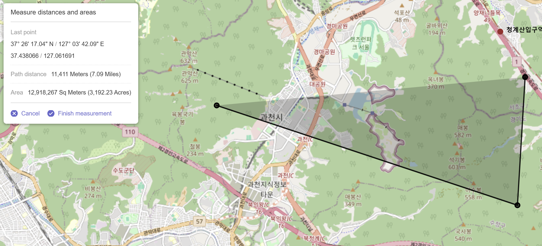 지도의 하단에는 거리 측정 도구가 있어, 사용자들이 특정 지점 간의 거리나 면적을 측정할 수 있습니다. 또한, 중요한 정보나 사용 방법을 설명하는 정보 박스도 제공됩니다.
