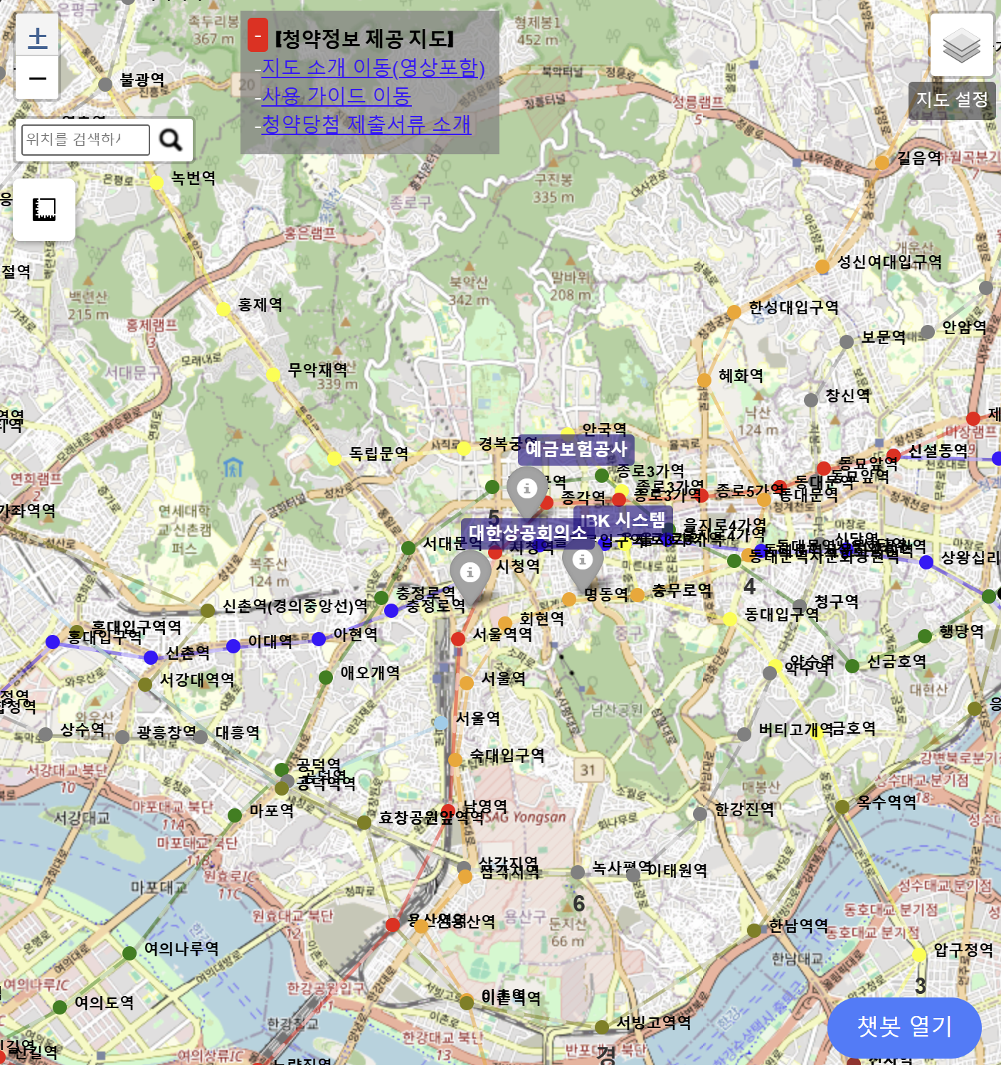 챗봇 기능을 설명하기에 앞서, 먼저 청약 정보 지도 서비스에 대해 간단히 소개하겠습니다. 이 서비스는 Folium 기반의 지도 플랫폼으로, 사용자에게 실시간으로 청약 정보를 제공하는 서비스입니다. 청약 가능 지역, 아파트 이름, 입주 예정일, 청약 접수 마감일 등의 다양한 정보를 지도 상에 시각화하여 보여주며, 서울, 인천, 경기 지역의 청약 정보를 직관적으로 탐색할 수 있도록 돕고 있습니다.