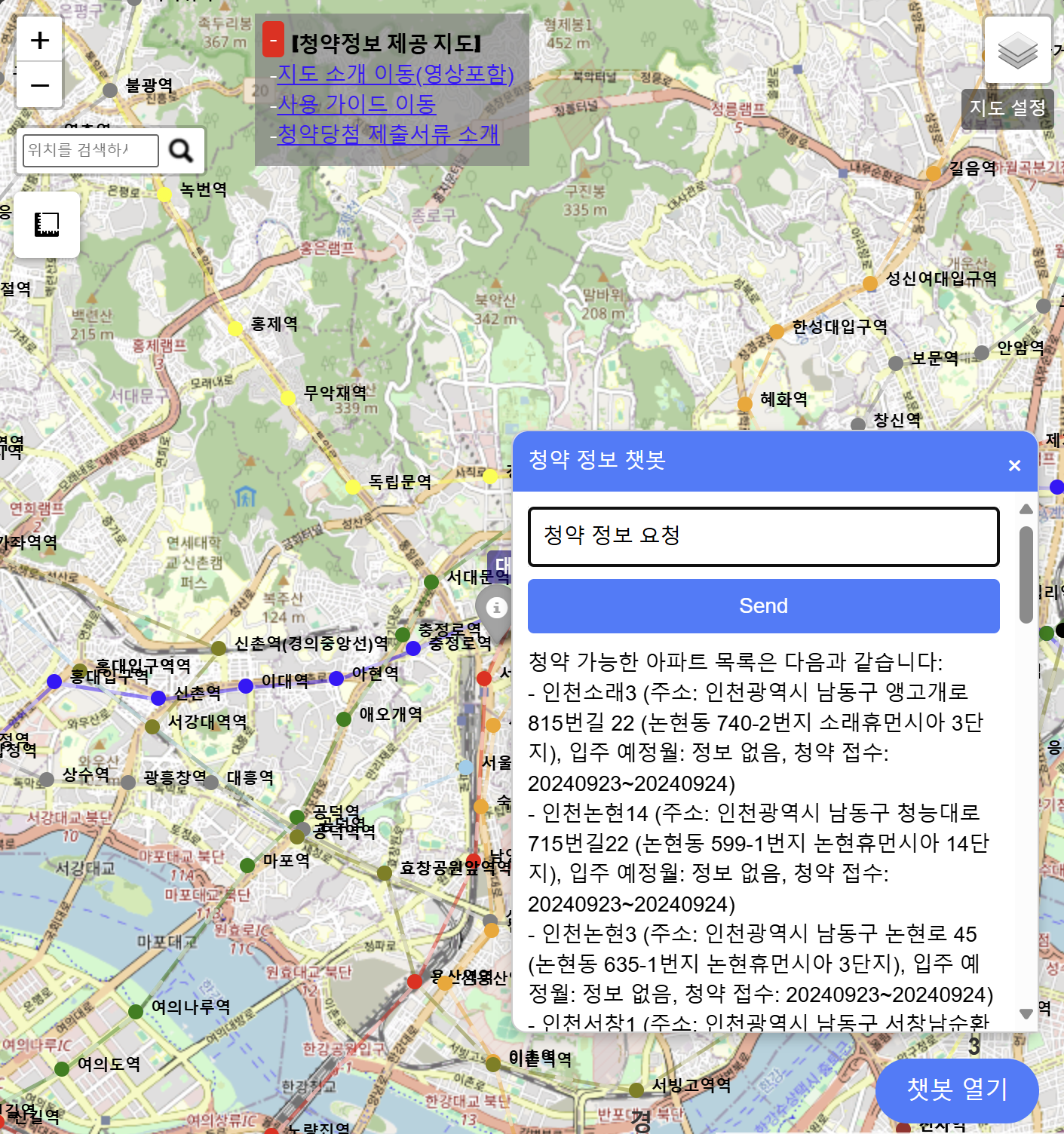 구독 맵 서비스에 챗봇을 통합한 것은 사용자에게 빠르고, 접근 가능하며, 맞춤형 청약 정보를 제공하는 중요한 진전입니다. 서울에서 특정 아파트를 찾거나, 지역별 최신 청약 정보를 살펴보고 싶다면 챗봇이 언제나 도와드릴 준비가 되어 있습니다. 앞으로도 더 많은 흥미로운 업데이트가 예정되어 있으니 많은 기대 부탁드립니다!