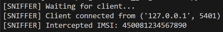 print(f"\[SNIFFER\] Intercepted IMSI: {data.decode()}")
