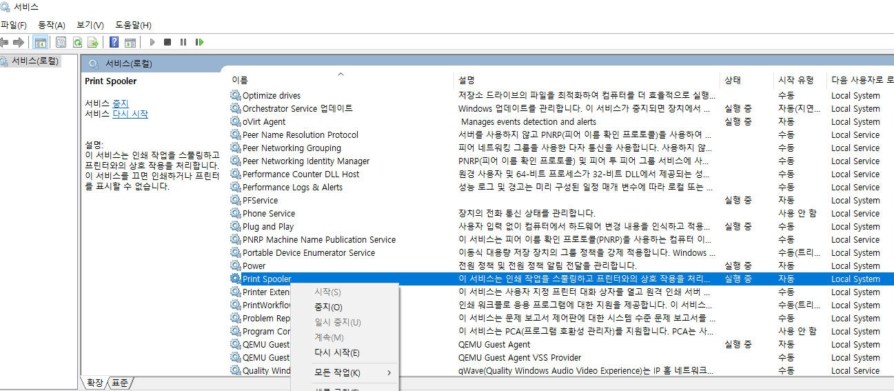 Windows + R) →services.msc์ ๋ ฅ Print Spooler์๋น์ค ์ฐํด๋ฆญ > ์ค์ง- ๋ค์ ์ฐํด๋ฆญ > ์์