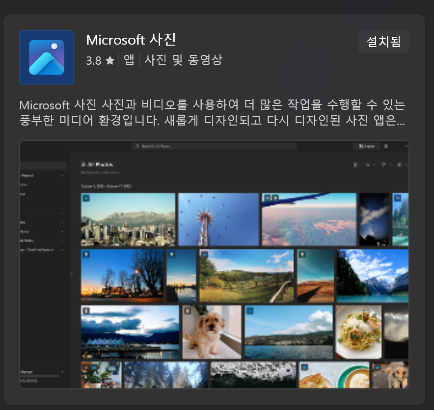 Microsoft Store가 정상적으로 작동하면, 사진 앱을 다운로드하여 설치합니다.