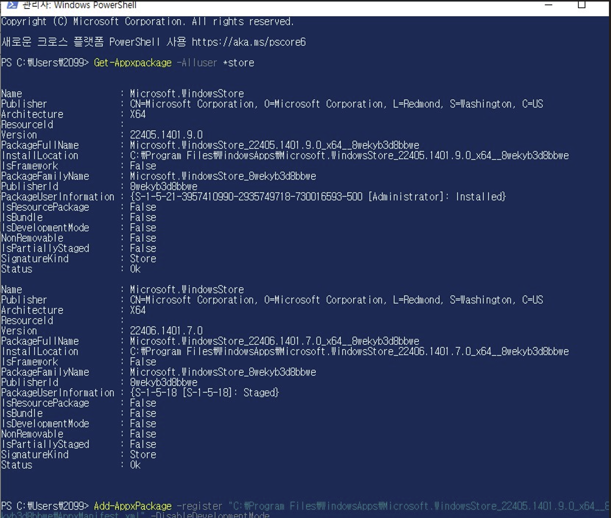 관리자 권한으로 PowerShell을 실행한 후, Microsoft Store의 설치 경로를 확인하고 복사해 둡니다. 아래 명령어를 PowerShell에 입력한 후 Enter를 누릅니다.