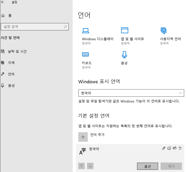 - 시간 및 언어 설정 > 언어 > 한국어 > 옵션